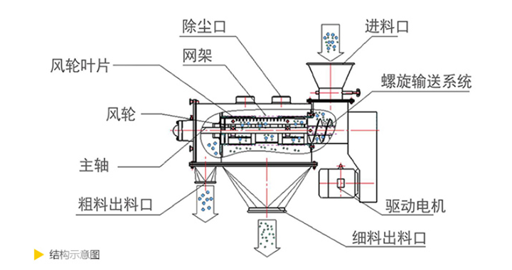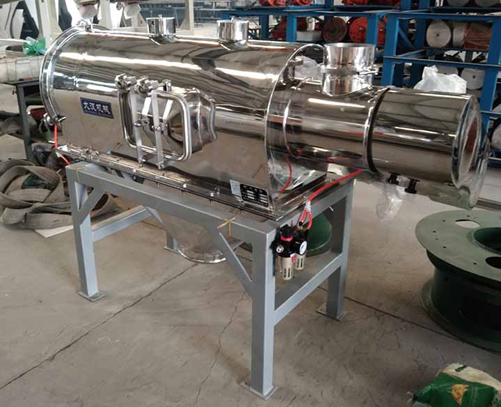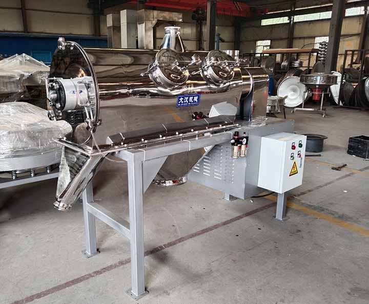 離心式篩分機(jī)從外觀上看上部為水平放置的圓柱形、下部為圓錐形的密閉容器,篩機(jī)下面有支腿以支撐整個篩機(jī)。電機(jī)通常位于設(shè)備頂部或底部,通過皮帶或直接驅(qū)動主軸。進(jìn)料口通常在筒的一端或頂部,物料通過管道或漏斗送入。出料口有兩處,一處是細(xì)顆粒出口,一處是大顆粒出口,一般在筒的另一端或筒側(cè)面。