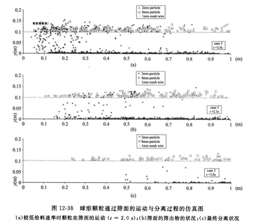 DEM仿真的過程信息能夠在線不同篩分工作條件下顆粒再篩面的運(yùn)動、顆粒同篩面之間的碰撞過程、顆粒通過篩網(wǎng)的分離過程,反映了不同力度顆粒在篩面上運(yùn)動形態(tài)的差異,再現(xiàn)不同振動篩分機(jī)工作條件下顆粒運(yùn)動過程,較為真實的描述顆粒同篩面之間的碰撞過程。圖12-38為Li等人模擬2mm和8mm球形顆粒通過篩面的運(yùn)動與分離過程圖。